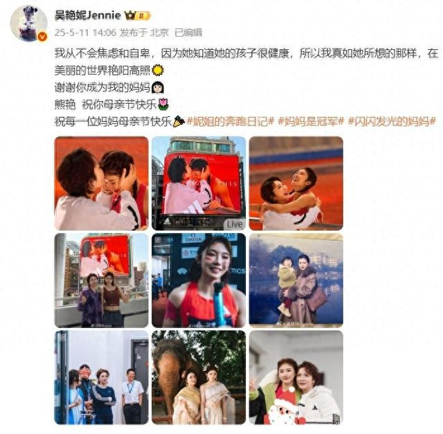 吴艳妮晒出了多张与母亲的合照,并配文写道:我从不会焦虑和自卑,因为她知道她的孩子很健康,所以我真如她所想的那样,在美丽的世界艳阳高照☀️谢谢你成为我的妈妈👩🏻熊艳 祝你母亲节快乐🌷祝每一位妈妈母亲节快乐🎉。
